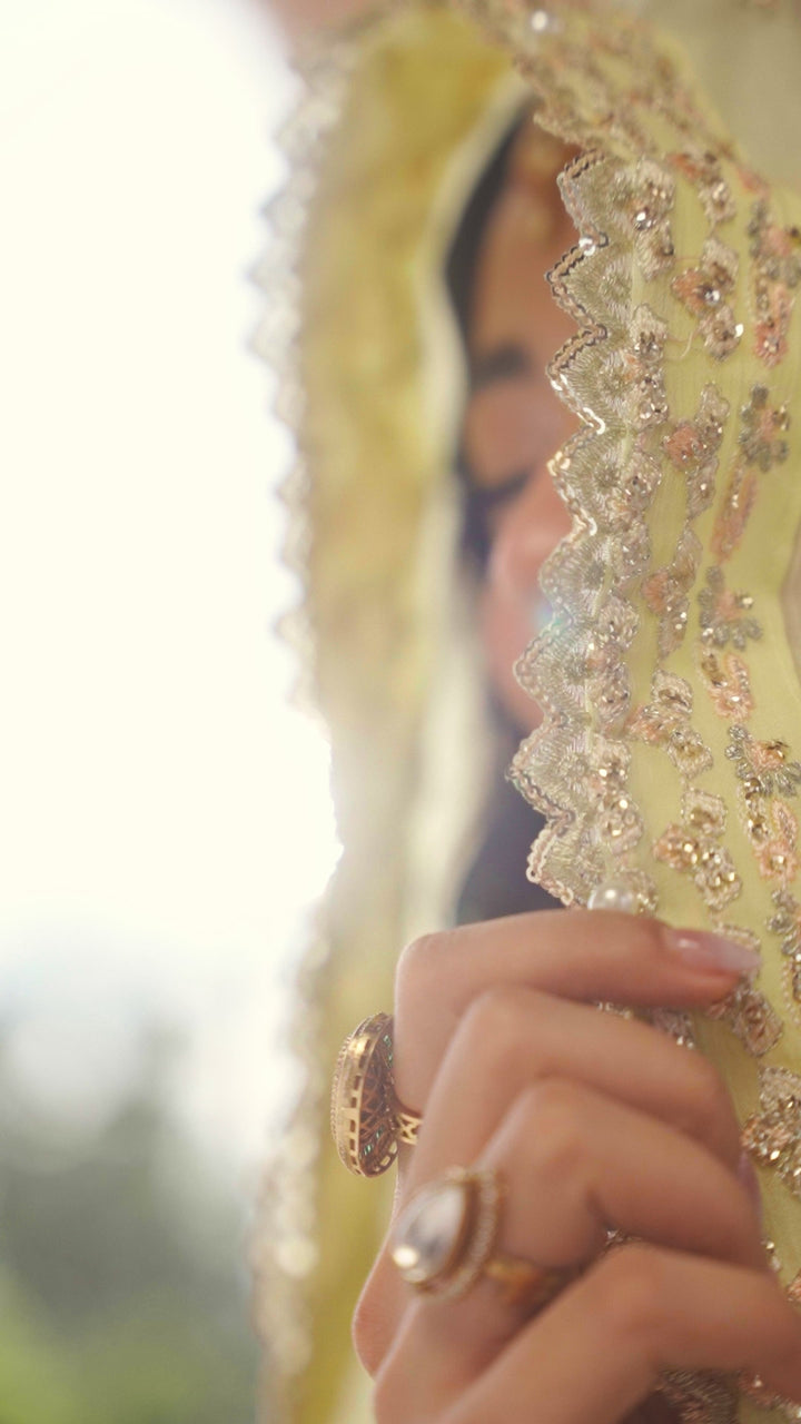 Graceful and radiant, Lumena from the Ember Collection features a pale yellow long shirt crafted on organza, richly hand-embellished with intricate detailing on the panels and sleeves. The look is completed with a delicately embroidered chiffon dupatta and an embroidered raw silk trouser, creating a timeless expression of elegance and festive sophistication.
