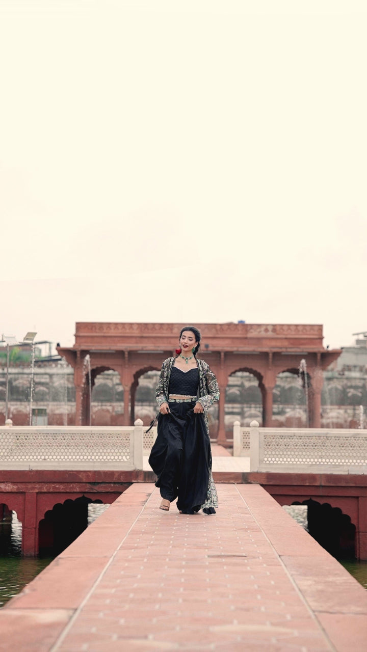 Dark, divine, and endlessly sophisticated Noir from the Ember Collection is the ultimate expression of timeless allure. Crafted on a sheer black organza base, the long shirt features meticulously hand-embellished panels and sleeves, adorned with intricate threadwork, sequins, and refined craftsmanship that glimmer with understated elegance. The look is completed with a digitally printed and embroidered organza dupatta bordered on all four sides and paired with a sleek raw silk trouser for a polished finish. Noir captures the perfect balance of grace and grandeur, an ensemble made to turn every occasion into a statement of style.