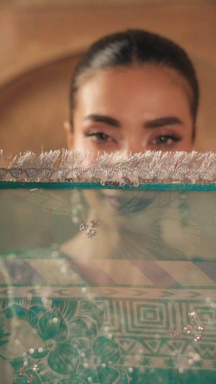 Inspired by the serene beauty of ocean hues, Ocean Bloom from the Ember Collection captures a refreshing blend of green and aqua tones. Crafted on a lustrous zari base, the ensemble features intricately hand-embellished panels, sleeves, and borders adorned with delicate threadwork, sequins, and shimmering accents. The look is elevated with a digitally printed and embroidered organza dupatta and a sleek raw silk trouser. a perfect balance of color, craftsmanship, and timeless elegance.