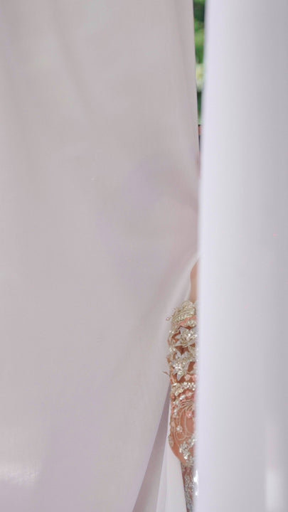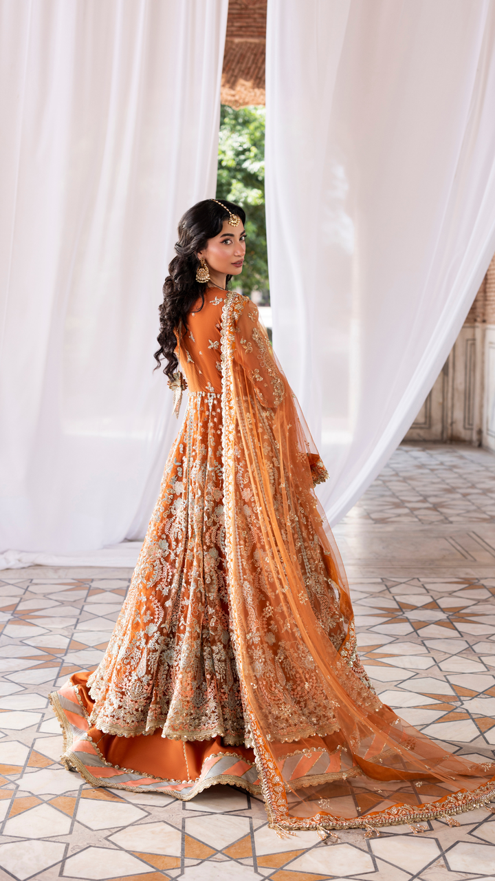 Drenched in a rich rust hue, Saffron from the Ember Collection embodies warmth, grace, and festive grandeur. Crafted on a delicate net base, this exquisite maxi dress features hand-embellished panels and sleeves adorned with intricate embroidery and shimmering accents. The fluid silhouette, paired with an embroidered dupatta and a refined raw silk trouser, captures timeless sophistication, perfect for festive soirées and unforgettable celebrations.